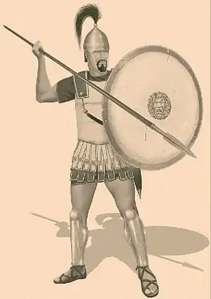 The Libyans supplied both heavy and light infantry and formed the most disciplined units of the army. The heavy infantry fought in close formation, armed with long spears and round shields, wearing helmets and linen cuirasses. The light Libyan infantry carried javelins and a small shield, the same as Iberian light infantry. The Iberian infantry wore purple bordered white tunics and leather headgear.[33] The Iberian heavy infantry fought in a dense phalanx, armed with solid metal javelins called "angon", long body shields and short slashing swords called "falcata".[34] Campanian, Sardinian and Gallic infantry fought in their native gear,[35] but were often equipped by Carthage. Polybius does not suggest that Hannibal's heavy Libyan infantry was equipped with the sarissa (pike), but a number of translations turned the Greek longche for javelin into pike by the wrong assertion that it means lance (lancea was originally a throwing weapon). There is a mention of a 5,000 men contingent on Zama fighting in Macedonian fashion. It is not clear what that exactly means. It could be a Macedonian-style phalanx or some troops using long two handed naval lances, a practice quite common among marines at that age and according to Plutarch also successfully employed by the Romans.[36] The claim of sarissa armed Carthaginian infantry is naturally disputed by experts capable of reading the Greek original, and Polybius himself is not clear, when he mentions Hannibal next to Pyrrhus in his famed comparison between the Roman manipular system and the Macedonian system.[37] It is not clear what the Macedonian system constitutes, pike blocks or combined arms tactics, although the variant of the Hellenistic empires was heavily reliant on their exclusive ethnic group forming the pike blocks, with others serving as numerous less relevant skirmishers. At that time, most Greek states fought with thureophoroi called scutarii by the Romans and it required wealth and manpower to field a pike-armed phalanx.