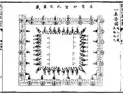 Qi Jiguang deployed his soldiers in a 12-man 'mandarin duck' formation, which consisted of four pikemen, two men carrying daos with a great and small shield, two 'wolf brush' wielders, a rearguard officer, and a porter.[63] This system bears some resemblance to European systems (pike and shot) developing in England where formations of arquebusiers would be protected by a group of pikemen.[64] Volley fire was also used.[65]