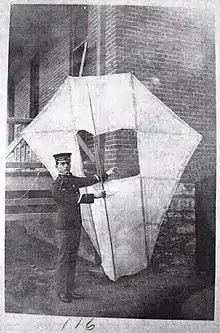 The first kite used by the United States Army Signal Corps specifically for raising an antenna was designed and built by Sergeant Thomas I. King, Signal Corps Company A, while stationed at Fort Leavenworth, Kansas, in 1905. The “King” kite was large, 7 feet high and 5 feet wide, made of 15 yards of white Japanese silk on a bamboo frame, and weighed less than 2 pounds.[2] Similar to Silas J. Conyne's kite of 1902,[3] it had a diamond shape with a squared-off top and bottom, keel, and large opening in the center to give it some of the stability of a box kite. It was used either singly or in trains of 2 to 4 kites or, on less windy days, in conjunction with a balloon to provide extra lift.