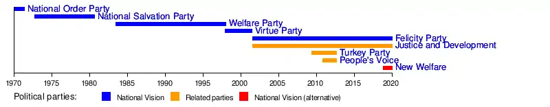 Following the ban of the Virtue Party (FP), a rift that had been developing in the movement resulted in two parties taking its place, the Felicity Party (SP) representing Erbakan’s old guard, and the Justice and Development Party (AK Party) led by younger and more pragmatic politicians around Recep Tayyip Erdoğan, which claims to have renounced a specifically Islamist agenda. The AK Party convincingly won the 2002 elections and formed a government with a strong popular mandate, that brought Turkey closer to acceptance for membership in the European Union than any previous government had done.
