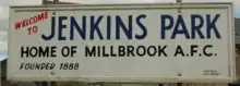 The club play at Jenkins Park on Mill Road. The ground was originally named Mill Park, but was renamed in 2014 after former professional footballer Reg Jenkins, who was born in the village and went on to become Rochdale's record goalscorer.[4] After retiring he returned to Cornwall and helped run the Millbrook football club.[5] The ground includes a covered stand on one side of the pitch, with other three sides railed off. The clubhouse is located behind one goal.[6]