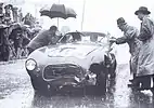 Car #704 with Hans Herrmann and Hermann Eger was said to be fastest in the early stages, though. Herrmann had already had a remarkable race in 1954, when the gate on a railroad crossing was lowered in the last moment before the fast train to Rome passed. Driving a very low Porsche 550 Spyder, Herrmann decided it was too late for a brake attempt anyway, knocked on the back of the helmet of his navigator Herbert Linge to make him duck, and they barely passed below the gates and before the train, to the surprise of the spectators. Herrmann was less lucky in 1955, having to abandon the race after a brake failure. Kling crashed also.