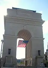 The arch inscription reads, in Latin: "This American monument was built to commemorate all peaceful accomplishment since the birth of Jesus Christ in the year of our Lord, MM."[3]