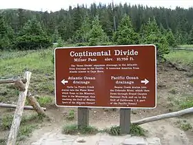 Milner Pass, elevation 10,759 ft (3,279 m)[1] is a mountain pass in the Rocky Mountains of northern Colorado in the United States. It is located on the continental divide in the Front Range, within Rocky Mountain National Park, along the boundary between Larimer and Grand counties. The pass provides the passage over the continental divide for US 34, also known as Trail Ridge Road between Estes Park and Grand Lake. The pass is not, however, the high point on Trail Ridge Road, which crests at 12,183 ft (3,713 m)[2] east of the pass within Rocky Mountain National Park. Along with the rest of Trail Ridge Road, the pass is generally closed in winter from the first heavy snow fall (usually October) until the opening of the road around Memorial Day. The gentle pass divides the headwaters of the Cache la Poudre River (which issues from Poudre Lake just east of the pass) and several creeks near the headwaters of the Colorado River to the west. The road near the pass provides a panoramic view of the Never Summer Mountains to the west.[2]
