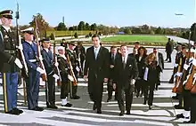 After the overthrow of Milošević, Đukanović faced a dilemma as he no longer could use Milošević's international standing to argue for Montenegro's independence from Yugoslavia.[40] In early 2002, Đukanović was subject to an investigation on international cigarette trafficking by the public prosecutor Giuseppe Scelsi of Bari.[41] Simultaneously, he was involved in negotiations ahead of the Belgrade agreement, and Javier Solana tried persuading him to abstain from independence at least temporarily[36] and that Montenegro should remain in Yugoslavia. After the meetings with Solana, Đukanović signed the Belgrade Agreement on 14 March 2002, in addition to the signatures of Filip Vujanović, Zoran Đinđić, Vojislav Koštunica, and Miroljub Labus.[42] The agreement led to the Constitutional Charter of Serbia and Montenegro.[43] It mandated that after a period of three years, Montenegro could hold a referendum on the question of independence. In a bid to prolong his executive powers, Đukanović and Prime Minister Vujanović agreed a job-swap that same year. Đukanović did not run for president in the 2002 election and Vujanović replaced him as the DPS candidate. On 25 November 2002, Đukanović resigned as president, several months before the end of his term, in order to become Prime Minister again. Vujanović, who had resigned as prime minister at the start of the month to become Speaker of the Montenegrin Parliament, was sworn in as acting president. Đukanović took office as prime minister on 8 January 2003. Vujanović succeeded him as president on 22 May 2003.
