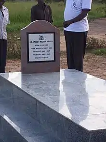 After his second removal from power, Obote fled to Kenya and later to Zambia. For some years, it was rumoured that he would return to Ugandan politics. In August 2005, however, he announced his intention to step down as leader of the UPC.[18] In September 2005, it was reported that Obote would return to Uganda before the end of 2005.[19] On 10 October 2005, Obote died of kidney failure in a hospital in Johannesburg, South Africa.[20]