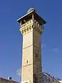 The last and most notable minaret was built in 1367 and is known as al-Asbat Minaret. It is composed of a cylindrical stone shaft (built later by the Ottomans), which springs up from a rectangular Mamluk-built base on top of a triangular transition zone.[18] The shaft narrows above the muezzin's balcony and is dotted with circular windows, ending with a bulbous dome. The dome was reconstructed after the 1927 earthquake.[18]