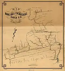 The Mine Hill & Schuylkill Haven Railroad (MH&SH) was operating by April 1831 in Schuylkill County, Pennsylvania, from above Mine Hill Gap (north of Minersville) to Schuylkill Haven on the Schuylkill Canal.[1] This railroad was developed by the New York and Schuylkill Coal Co.,[2] and was one of the important early “lateral” railroads of Schuylkill county which were constructed to accommodate the Schuylkill canal (in this case located at Schuylkill Haven) with coal tonnage from the more remote areas where mines were operating.[3] In 1862 the MH&SH was leased by the Philadelphia and Reading Railroad Company (P&RR) and became part of its operation system.[4]