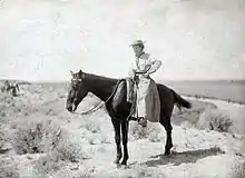 Minerva Teichert was born on August 28, 1888 in Ogden, Utah Territory.[2] She was the second of ten children born to Frederick John Kohlhepp, a railroad worker and rancher, and Mary Ella Hickman, a suffragette and pamphleteer.[3]:33, 180 Teichert grew up on a ranch in Idaho, taking advantage of her upbringing by sketching horses and ranch life from a young age.[4][3]:26 Her mother gave her her first set of watercolors when she was just four years old. For entertainment, she acted out plays and helped her father work on the farm.[2] She enjoyed riding her horse, exploring and sketching scenes from nature.[5] Both of her parents supported her creativity and imagination.[3]:180 She was named after her maternal grandmother, Minerva Wade Hickman, who was one of the wives of frontier lawman and express rider "Wild Bill" Hickman, and also a descendant of Colonial Governor Thomas Roberts of New Hampshire.[3]:180