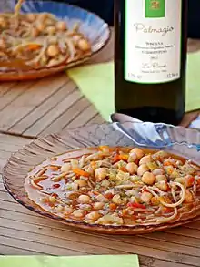 Minestra di ceci (chickpea soup) is a soup in Italian cuisine prepared with chickpeas as a primary ingredient.[1] Dried chickpeas that have been soaked or canned chickpeas may be used. Additional ingredients can vary, and may include foods such as salt cod, chestnuts, artichoke, potato, tomato, pasta, and cabbage, among others.[1][2] Soup base ingredients may include olive oil, garlic, onion, carrot, and celery, among others.[1]