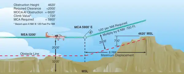 For example, see the illustration above. In this case, a segment of an airway ending at fix ABC has a MEA of 5200 feet MSL, and the minimum obstacle clearance altitude (MOCA) required to clear an obstacle six nautical miles from the fix within the next segment is 6620 feet MSL. The total increase in altitude from 5200 feet to 6620 feet over that distance is 1420 feet. At a normal rate of climb (120 feet per nautical mile at this altitude), the maximum altitude that can be gained over that distance is 720 feet, which is 700 feet below the required MOCA. Thus, a MCA for fix ABC of 5900 feet MSL (700 feet above the MEA of the previous segment) will be published for fix ABC for traffic continuing into the airway segment concerned from that fix.