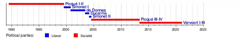7 May 2013 | Incumbent | 7 years, 270 days | PS | Vervoort I | Open VLD, CD&V, Groen | PS, Ecolo, cdH |
