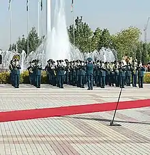 The Commandant Regiment of the Ministry of Defense (Tajik: Полки комендантӣ вазорати мудофиаи) is the official security unit the ministry responsible for the protection of government officials. It is based in Dushanbe, and provides security for the building of the ministry, the parliament building, and the Kohi Millat. It is the Tajik equivalent to the Commandant's Office of the Moscow Kremlin. The Honour Guard Company of the Ministry of Defense (Tajik: Ротаи Каровули Фахри вазорати мудофиаи) is one of two ceremonial units of the Armed Forces of the Republic of Tajikistan with the other being the special unit of the Presidential National Guard. The company is a purely representative unit made up of members of branches of the armed forces (specifically the Tajik National Army, Tajik Mobile Forces, Tajik Air Force, Presidential National Guard) and serves under the command of the Commandant Regiment. The time frame for drafting into the unit is 3 to 6 months.[9] Its missions include guarding important public buildings in Dushanbe and providing honours for foreign dignitaries and government officials at the Kohi Millat. The company has taken part in many international ceremonies and parades including in a parade on Tiananmen Square in honour of V-J Day in 2015[10][11][12] and a military parade on Red Square in 2020.