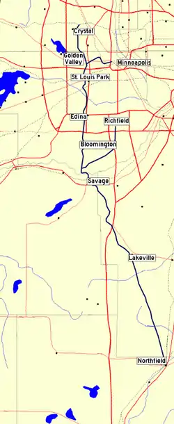 As finally constructed, the MN&S mainline ran in what is now the west metro of the Twin Cities. From its junction with the Minneapolis, St. Paul and Sault Ste. Marie Railroad at MNS Junction in Crystal, it traveled through New Hope, Golden Valley, St. Louis Park, Edina, Bloomington, Savage, Lakeville and down to Northfield. Along the way, the line connected the Soo Line with the Milwaukee Road, the Omaha Road, the Chicago Great Western and the Rock Island's St. Paul to Kansas City "Spine Line". They had shops at Glenwood on a spur line that went from the present area of Hwy 100 and Hwy 55 to the edge of downtown Minneapolis, and along that spur had connections to the Minneapolis and St. Louis Railway and Great Northern Railway. In addition, the original passenger "High Line" ran from Auto Club Junction in Bloomington through Richfield and into south Minneapolis, ending just north of the current Crosstown freeway.