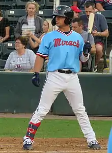Rortvedt made his professional debut that same year with the Gulf Coast League Twins before being promoted to the Elizabethton Twins. In 33 games between the two clubs, he batted .222 with ten RBIs.[78] He spent 2017 with the Cedar Rapids Kernels where he compiled a .224 batting average with four home runs and 30 RBIs in 89 games, and 2018 with both Cedar Rapids and the Fort Myers Miracle,[79] slashing a combined .262/.331/.379 with five home runs and 43 RBIs in 90 total games between the two clubs.[80] He returned to Fort Myers to begin the 2019 season,[81] and was promoted to the Pensacola Blue Wahoos in May, with whom he finished the year. Over 79 games between the two teams, he hit .238/.334/.379 with seven home runs and 29 RBIs.[82]