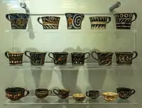 The pottery consists of vessels of various shapes, which as with other types of Ancient Greek pottery may be collectively referred to as "vases", and also "terracottas", small ceramic figurines, models of buildings and some other types. Some pieces, especially the cups of rhyton shape, overlap the two categories, being both vessels for liquids but essentially sculptural objects. Several pottery shapes, especially the rhyton cup, were also produced in soft stones such as steatite, but there was almost no overlap with metal vessels. Pottery sarcophagus chests were also made for cremated ashes, as in an example now in Hanover.