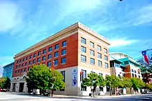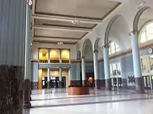 With an original estimated cost of US$1 million, Union Station was constructed by the American Construction Company for an eventual total of five times that amount.[17] Exterior walls were constructed of granite, limestone, and terracotta, while the interior used an extensive amount of marble. It was completed and opened on March 1, 1911. At the time, Houston, with 17 railways, was considered the main railroad hub of the Southern United States.[18] This is also evident by the Seal of Houston, which prominently features a locomotive. Two more floors were added the following year.[19]