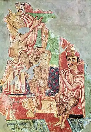 This Romanesque style is thought to be the work of a Buddhist painter known as "Titus" (𐨟𐨁𐨟, Tita), who signed his painting at Miran with his name in Indian Kharoshti characters, and who was perhaps a Roman artist who traveled east along the Silk Roads in search of employment.[10][11][12] Several artefacts have been found at the Miran site, including bows and arrows.[13]