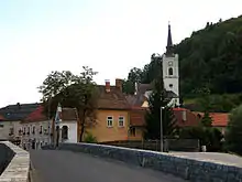 The larger part of the older part of Mirna is situated on the left bank of the river, and a smaller part on the right bank.[9] Both parts are connected with a stone bridge dating to the 18th century and a wooden footbridge next to it.[9][13] The oldest part of the town with St. John's the Baptist church lies at the foot and the southwestern slope of the Trbinc Hill, whereas the younger part has grown at the ridge on the other side of the Mirna river, which turns 90° here.[14] The lowest parts along the Mirna banks have been settled by industry, which employs people from the whole basin as well as the nearby hilly areas.[4]
