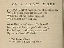 Miscellanies also presented themselves as performing an important cultural or curatorial role, by preserving unbound sheets, fragments and ephemera which otherwise would have been lost – and thus offering a unique insight into the vibrant literary life of the 18th century. A prime example of such curiosity-shop publications is The fugitive miscellany: a collection of fugitive pieces in prose and verse (1774),[ebook 18] which includes nonsense rhymes, epitaphs, inscriptions, poems made out of newspaper cuttings, as well as wills written in verse. Late twentieth-century criticism has drawn attention to the cultural and literary importance of these non-canonical, lesser-known and ephemeral kinds of popular verse – such as the recent discovery of a poem spuriously attributed to John Milton, “An Extempore upon a Faggot”.[36] As the most prolific source of anonymous or pseudonymous publication, miscellanies provide insight into the unconventional history of English literature. Roger Lonsdale notes in his influential anthology, The New Oxford Book of Eighteenth-Century Verse (1984): “One of the most interesting poets [from this period] is the ubiquitous ‘Anonymous’, whose voice almost never registers in conventional literary history”. Crucially, he suggests that we would know more about “the landscape of eighteenth-century poetry” if more attention was paid to “the innumerable miscellanies by several hands”.[37]