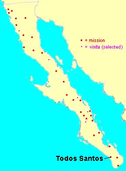 In 1724, Jesuit priest Jaime Bravo, stationed at the Misión de Nuestra Señora del Pilar de La Paz Airapí at present day La Paz, Baja California Sur, founded a visita (subsidiary post to a mission) at a place he named Todos Santos, which was near the Pacific Ocean. In the deserts of Baja California, Todos Santos was attractive because of a relative abundance of water, tillable land, and good grazing for livestock. The site was inhabited by Uchiti Indians, probably a band of the Guaycura people.[1] The visita became the mission of Santa Rosa in 1733 under Sigismundo Taraval.
