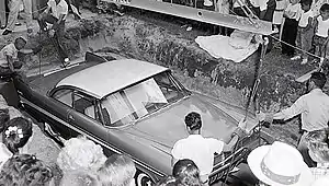 In the years leading up to the anticipated opening of the vault, speculation abounded on the car's condition. Many felt that the car would be found in near pristine condition, but others expressed concern that moisture may have entered the vault causing moderate to extensive damage.[1][26] It was not known if a nearby construction accident in 1973, in which a water main was damaged flooding the area, had any effect on the vault.[27] After eighteen months of preparations by a group of volunteers, the vault was opened on June 14, 2007, during the state's centennial celebration.[10] In press interviews, the 2007 organizing committee co-chairwoman Sharon King Davis acknowledged that she was the person who had named the vehicle Miss Belvedere.[6] However, the official website used leading up to the event did not feature the Miss Belvedere name.[28] Interest in the event became international, with news organizations and interested people from abroad making plans to attend the event.[29] Organizers had made arrangements with vehicle customizer Boyd Coddington, under a sponsorship arrangement with Amsoil, to use the sponsors products in starting the car when it was removed from the vault.[30][31] A local crane service had volunteered to lift the car out of the vault, and customized lifting equipment was fabricated for the job. An identical model Plymouth Belvedere was found and test lifts were made with the vehicle to ascertain the center of gravity for the lift.[32]