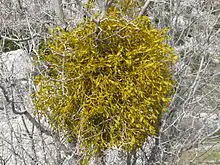 Mistletoe is the common name for obligate hemiparasitic plants in the order Santalales. They are attached to their host tree or shrub by a structure called the haustorium, through which they extract water and nutrients from the host plant. Their parasitic lifestyle has led to some dramatic changes in their metabolism.[1]