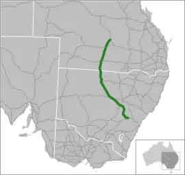 Approximately 5 kilometres (3 mi) north of Bourke it crosses the Darling River before heading into Bourke where it forms junctions with the Kamilaroi Highway heading east and the Kidman Way heading south. From this point the highway generally heads southeast through Nyngan where it forms a junction with the Barrier Highway. From this point until its southern terminus, the Mitchell carries the National Highway A32 shield. At Nevertire the Mitchell forms a junction with the Oxley Highway, before passing through Narromine and then heads generally east to the major rural centre of Dubbo where it meets with the Newell Highway and connects to the Golden Highway before crossing the Macquarie River and heading south towards Wellington, again crossing the Macquarie River. At Molong the Mitchell generally starts to head east towards Orange, where an alternative route diverts many heavy vehicles away from the city centre. The portion of the Mitchell Highway that passes through Orange city centre is known as Summer Street.[8] The Mitchell Highway's southeastern terminus is at a roundabout in Bathurst, at the junction of the Mid-Western Highway to Cowra and the Great Western Highway to Sydney via the Blue Mountains.[5][6][2]