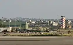 During the 2011 Libyan civil war, the Times of Malta and The Guardian reported claims that the airport had been taken over by protesters opposed to Libyan leader Muammar Gaddafi.[7][8] On 13 March 2011, Ali Atiyya, a colonel of the Libyan Air Force at the airport, defected and joined the anti-Gaddafi forces.[9] On 21 August 2011, rebels launched an assault on Mitiga as part of a bid to battle loyalist forces in Tripoli, sustaining a number of casualties in the process.[10] On 25 October 2011 Google Earth released multispectral imagery from GeoEye taken on 28 August 2011 which showed the airfield as well as the highly capable MiG-25 aircraft with no visible damage. This imagery confirmation helped validate the reporting which suggested the airfield had been taken over early on by opposition protesters as NATO and US air forces would want to avoid collateral damage to the opposition movement.[11]