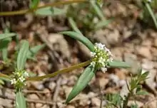 This is a perennial herb with many erect or spreading branches growing up to about 45 centimeters tall. The linear or lance-shaped leaves are up to 4.5 centimeters long. The inflorescence is a rounded head of tiny white flowers.[2]
