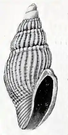 (Original description) The solid, yellowish shell has an elongate oval shape. It contains five whorls, including a pointed protoconch of two smooth whorls. The spire whorls are convex. The suture is well impressed. The base of the shell is contracted. The aperture is elongate oval, not constricted into a siphonal canal. The outer lip is simple and convex in outline. The columella is slightly curved. The shell shows numerous straight rounded axial ribs that extend across the whorls, and over about two-thirds of the body whorl there are about 24 on the penultimate whorl. They are separated by deep grooves, which are narrower than the ribs. There is one distinct spiral groove or depression below the suture. Numerous faint spirals, which can scarcely be seen without a lens, cross the shell, and are most conspicuous in the grooves. They become much stronger on the base.[2]