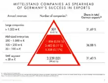 This pyramid shows that over 99% of German firms are Mittelstand firms but 0.34 depart from the classic small and medium-sized enterprise (SMEs) definition. The two categories of 'classic' and 'upper' Mittelstand firms in Germany account for 68% of Germany's exports. In comparison, Germany's larger corporations generate 32% of Germany's exports.[8] The 'upper'-sized Mittelstand firms (revenues between 50 million EUR and 1 billion EUR) form a unique and distinctive group, as they are the most export-orientated group of firms in Germany's business landscape contributing significantly to Germany's sustained export success. As such, Mittelstand firms clearly form the backbone of the German economy.[14]