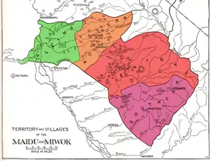 1925 map of the Plains and Sierra Miwok territories