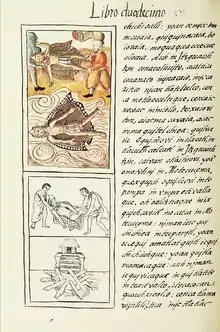 Franciscan friar Bernardino de Sahagún recorded two versions of the conquest of Mexico from the Tenochtitlán-Tlatelolco viewpoint. In Book 12 of the twelve-volume Florentine Codex, the account in Spanish and Nahuatl is accompanied by illustrations by natives. One is of the death of Moctezuma II, which the indigenous assert was due to the Spaniards. According to the Codex, the bodies of Moctezuma and Itzquauhtzin were cast out of the Palace by the Spanish; the body of Moctezuma was gathered up and cremated at Copulco.