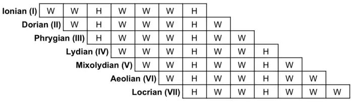 to major scaleInterval sequence Example Ionian I W–W–H–W–W–W–H C–D–E–F–G–A–B–C Dorian ii W–H–W–W–W–H–W D–E–F–G–A–B–C–D Phrygian iii H–W–W–W–H–W–W E–F–G–A–B–C–D–E Lydian IV W–W–W–H–W–W–H F–G–A–B–C–D–E–F Mixolydian V W–W–H–W–W–H–W G–A–B–C–D–E–F–G Aeolian vi W–H–W–W–H–W–W A–B–C–D–E–F–G–A Locrian viiø H–W–W–H–W–W–W B–C–D–E–F–G–A–B