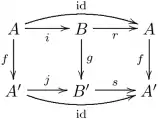 - Retracts: if g is a morphism belonging to one of the distinguished classes, and f is a retract of g (as objects in the arrow category , where 2 is the 2-element ordered set), then f belongs to the same distinguished class. Explicitly, the requirement that f is a retract of g means that there exist i, j, r, and s, such that the following diagram commutes: