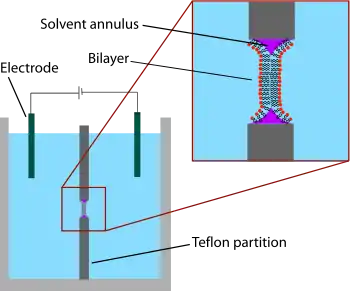 The term “black” bilayer refers to the fact that they are dark in reflected light because the thickness of the membrane is only a few nanometers, so light reflecting off the back face destructively interferes with light reflecting off the front face. Indeed, this was one of the first clues that this technique produced a membrane of molecular-scale thickness.[4] Black lipid membranes are also well suited to electrical characterization because the two chambers separated by the bilayer are both accessible, allowing simple placement of large electrodes. For this reason, electrical characterization is one of the most important methods used in conjunction with painted lipid bilayers. Simple measurements indicate when a bilayer forms and when it breaks, as an intact bilayer has a large resistance (>GΩ) and a large capacitance (~2 µF/cm2). More advanced electrical characterization has been particularly important in the study of voltage gated ion channels. Membrane proteins such as ion channels typically cannot be incorporated directly into the painted bilayer during formation because immersion in an organic solvent would denature the protein. Instead, the protein is solubilized with a detergent and added to the aqueous solution after the bilayer is formed. The detergent coating allows these proteins to spontaneously insert into the bilayer over a period of minutes. Additionally, initial experiments have been performed which combine electrophysiological and structural investigations of black lipid membranes.[5] In another variation of the BLM technique, termed the bilayer punch, a glass pipet (inner diameter ~10-40 µm) is used as the electrode on one side of the bilayer in order to isolate a small patch of membrane.[6][7] This modification of the patch clamp technique enables low noise recording, even at high potentials (up to 600 mV), at the expense of additional preparation time.