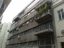 Influenced by Le Corbusier, Walter Gropius, and Erich Mendelsohn,[18] as well as more conservative architects such as Michel Roux-Spitz,[19] virtually every apartment building that was built in Athens during that decade followed this style. These buildings are characterized by the bay windows which can protrude up to 1.4 metres under the 1929 General Building Regulation, the non-existent or subtle ornamentation such as occasional Art Deco motifs, especially on ironwork, and spacious entry halls. They often have permanent decorative pergolas on the terraces of the top floors. The use of bay windows produces a plasticity effect to the façades. An example of an apartment building with completely unadorned façades and many bay windows is the famous Ble Polykatoikia near Exarcheia Square designed in 1932 by Kyriakos Panagiotakos.[20] Other architects used bolder Corbusian features on their buildings with flat façades without bay windows and with long horizontal windows. One such example is the apartment building on Stournari and Zaimi Streets designed by Thoukydidis Valentis and Polyvios Michailidis in 1933.[21]