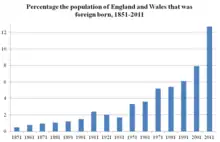 About 70% of the population increase between the 2001 and 2011 censuses was due to foreign-born immigration. 7.5 million people (11.9% of the population at the time) were born overseas, although the census gives no indication of their immigration status or intended length of stay.[3]