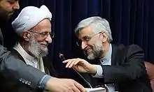 In 1997, after the election of President Mohammad Khatami, Mesbah Yazdi encouraged Iran's Revolutionary Guards and Hezbolli to put a stop to the reform agitation by any means, including violence.[12] After decline of the reform movement in 2003, his supporters made gains in local and parliamentary elections. In 2005, Mesbah Yazdi supported Mahmoud Ahmadinejad's presidential bid and subsequently gained "direct influence" in the Iranian government through the appointment of loyal supporters "to high posts" after Ahmadinejad's victory.[18] By 2011, however, he was sharply critical of Ahmadinejad saying that he was behaving "unnaturally" and needed to be "saved."[19] After Ahmadinejad fired intelligence minister Heydar Moslehi without consulting Supreme Leader Ali Khamenei, Mesbah Yazdi stated, "That a human being would behave in a way that angers his closest friends and allies and turns them into opponents is not logical for any politician."[20]