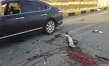 On 27 November 2020, Fakhrizadeh was ambushed while traveling in a black Nissan Teana (pictured right) on a rural road in Absard, a city near Tehran.[11][36][50][51] Accompanied by a convoy of three armored vehicles, he was driving with his wife in a bullet proof car.[52][53] The convoy carried eleven bodyguards.[54] Many reports of the incident are conflicting and there are multiple competing narratives.[52] Iranian officials have blamed Mujahideen-e-Khalq and Israel.[49]