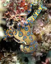 All octopuses are venomous,[46] but only a few species pose a significant threat to humans. Blue-ringed octopuses (Hapalochlaena) from Australia and New Guinea have a powerful venom and warning coloration. They bite humans only if severely provoked,[43] but their venom kills a quarter of the people bitten. Another tropical species, Octopus apollyon, causes severe inflammation that can last for over a month even if treated correctly.[47] The bite of O. rubescens can cause necrosis that lasts longer than one month if untreated, and headaches and weakness persisting for up to a week even if treated.[48]