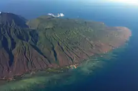 Molokaʻi developed from two distinct shield volcanoes known as East Molokaʻi and the much smaller West Molokaʻi. The highest point is Kamakou[7] on East Molokaʻi, at 4,970 feet (1,510 m). Today, East Molokaʻi volcano, like the Koʻolau Range on Oʻahu, is what remains of the southern half of the original mountain. The northern half suffered a catastrophic collapse about 1.5 million years ago and now lies as a debris field scattered northward across the bottom of the Pacific Ocean.[8] What remains of the volcano on the island include the highest sea cliffs in the world.[9] The south shore of Molokaʻi boasts the longest fringing reef in the U.S. and its holdings—nearly 25 miles (40 km) long.[10]