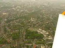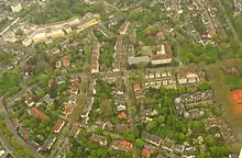 From 1908 on, the roughly half a square kilometre site purchased by the City was developed: splendid mansions were constructed, as were semi-detached and terraced houses and company head offices, built according to individual plans and to suit the respective owner's finances – in the style of Reform Architecture (German: Reformarchitektur) throughout. With a clock tower towering above everything, the Königliche Baugewerkschule (Royal Building College) Essen, the centrepiece of the quarter, was constructed between 1908 and 1911.[1] The Staatliche Ingenieurschule für Bauwesen (State Civil Engineering College) later occupied the building, and this was succeeded by the Kaufmännische Schule III der Stadt Essen (Commercial College III of the City of Essen) on 30 August 1982. This was renamed to Robert-Schmidt-Berufskolleg (Robert Schmidt Vocational College) in August 2000.[2] Georg Metzendorf, Edmund Körner and other prominent architects created in the immediate vicinity architecture for the prosperous middle classes, architecture which at that time provided residences of a high, sometimes the highest standard – especially in the form of prestigious mansions. Even after a hundred years, they constitute a desirable residential quarter. At Moltkeplatz, Otto Bartning built his first church in Germany (consecrated in 1910) for the Old Lutheran parish (now SELK – Independent Lutheran Church). Subsequently, he designed the nearby Church of the Resurrection (Auferstehungskirche), built in 1929, which is one of the most important models for modern church construction in central Europe. At the corner of Moltkestrasse and Camillo-Sitte-Platz, the building housing the residence and studio (subsequently only the studio) of Edmund Körner was constructed in 1928/29, exhibiting both elements of the Neues Bauen movement and industrial structures, such as at the mine site Zeche Zollverein. Many of the old buildings and the Moltke Bridge are listed monuments. A major portion of the quarter has been subject to a preservation statute since 1983, something to which the quarter's "traditionally self-confident residents" are highly committed.