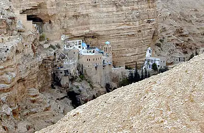The Monastery of Saints John and George of Choziba, best known as Saint George Monastery in Wadi Qelt (Arabic: دير القديس جورج) or simply the Monastery of Choziba, is a monastery located in Wadi Qelt, in the eastern West Bank, in Area C. Its Arabic name is Mar Jaras.[1] The cliff-hanging complex, which emerged from a lavra established in the 420s and reorganised as a monastery around AD 500,[1] with its ancient chapel and irrigated gardens, is active and inhabited by Greek Orthodox monks. It is reached by a pedestrian bridge across Wadi Qelt, which many believe to be Psalm 23's "valley of the shadow of death".[2] The valley parallels the old Roman road to Jericho, the backdrop for the parable of the Good Samaritan (Luke 10:29–37). The monastery is open to pilgrims and visitors.[3]