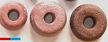 Ovruch slate spindle whorl - spindle whorl, carved out of pink and red slate stone (pyrophyllite slate), which was mined in the territory of present-day Ukraine, near the town of Ovruch in the 10th - 13th centuries. Ovruch masters diligently repeated the most successful form of a clay spindle whorl - biconical (the weight as if consisted of two truncated cones connected by broad bases) The spindle whorl weighed on average about 16 g, the height was from 4 to 12 mm, the outer diameter was from 10 to 25 mm, the diameter of the hole for the spindle was 6–10 mm. If the spindle whorl turned out to be too narrow, it was wrapped with a thread so that it would not slip during rotation. Slate - soft stone; on the samples found by archaeologists, there are still scuffs from the threads.[13] The production of slate spindles in Ovruch was designed for wide sales. The merchants who bought the consignment of the spindle whorls made a considerable way with them, sold them in different lands. Ovruch spindle whorls are found by archaeologists not only in the territories of Kievan Rus, but in other regions. Production of spindle whorls was designed for a wide sale.[14] According to A. V. Artsikhovsky, "they are exactly the same in Kiev and Vladimir, in Novgorod and Ryazan, even in Cherson, in the Crimea and in the Bulgaria on the Volga." The Ovruch spindle whorls were so valued that the owners carved their personal tags on them, and after the spread of writing - carved their names. In the 13th century, the stone spindle whorls become clay again: the Tatar-Mongol invaders destroyed Ovruch workshops.[15]