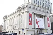The Mongolian Stock Exchange is located in the former Children's Cinema building near Sükhbaatar Square, next to the headquarters of Mongolia Telecom Company and across from the Mongolian parliament's buildings. It was refurbished at a cost of US$4.5 million prior to the official start of trading; seats and screens were removed, a trading floor was created and equipped with computers, and automatic sinks were installed in the bathrooms.[11][13] The building itself is a pink-and-white neo-classical-style structure.[16] One corner of the building has been partitioned off to serve as an internet cafe.[28] Due to the color of its building, the Financial Times correspondent, Leslie Hook, defined it the pink house of equities.[26] Since then the building has been painted gray.