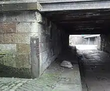 When the "cut of junction" was formed, a short section of new canal linking the Monkland Canal to the Forth and Clyde branch canal, it was routed north from the basin under Garngad Hill (now Royston Hill).[1] The route then turned west under Castle Street. The grooves worn by the barge towropes can be seen on the iron facing to Castle Street bridge abutment at this point.[4]