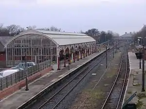 Monkseaton has been served by a station since June 1864,[2] with the station at the current site opened in July 1915, under the North Eastern Railway.[3] Following closure for conversion in the late 1970s, much of the original North Eastern Railway station building, dating from 1915, was retained. However, the southbound platform (trains towards South Shields) and buildings were demolished and replaced.