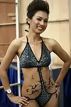 Some manufacturers and retailers refer to modern monokini swimsuit designs as a topless swimsuit, topless bikini,[9] or unikini.[10]